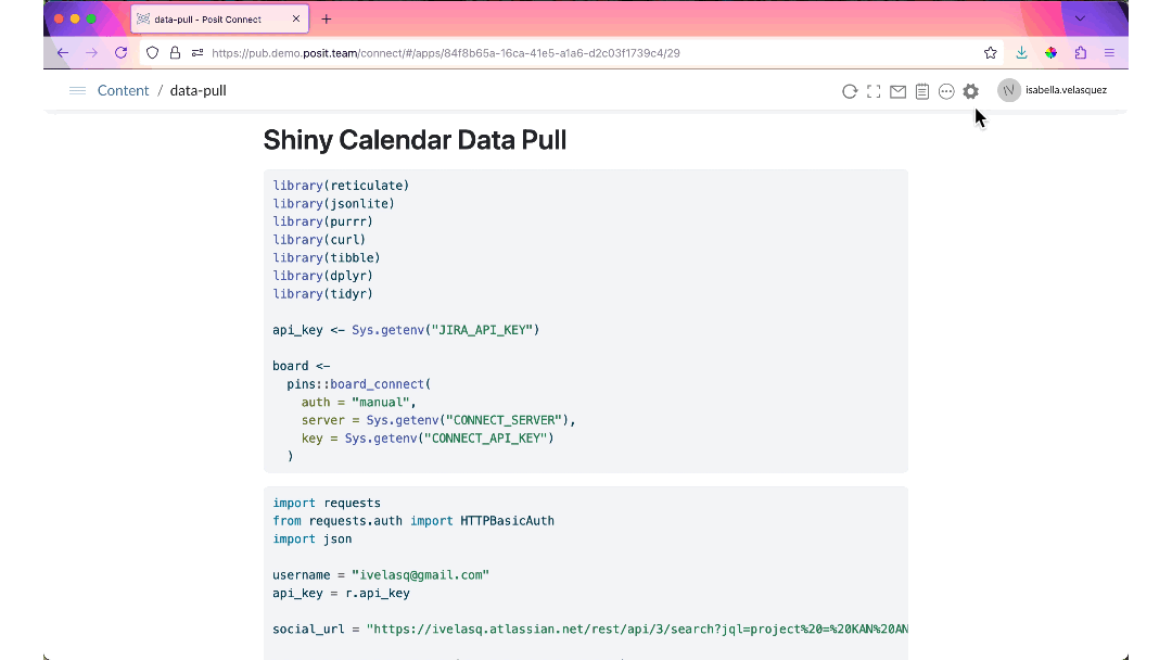 To run this workflow, we start by retrieving the desired Jira API data. Using Posit Workbench, we create a document called data-pull.qmd to pull and clean the data. Next, we connect to our Posit Connect pin board and write the cleaned data to a pin. This process can be scheduled to run automatically. We then develop our Shiny app in app.R, also within Posit Workbench, and deploy it to Posit Connect. By using pin_read_reactive, the Shiny app will automatically update whenever it detects changes in the pin on Posit Connect.